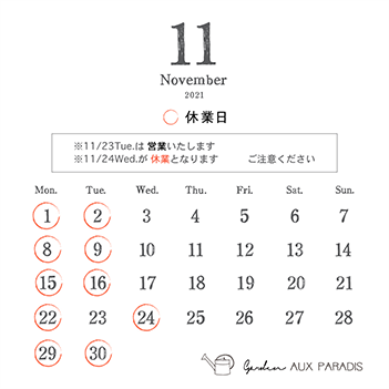 garden AUX PARADISと、AUX PARADIS 那須店の11月の定休日のお知らせです。※ 11/23(火・勤労感謝の日)は営業いたします。11/24(水)はお休みさせていただきます。ご注意ください。garden AUX PARADIS ガーデン オゥパラディ店栃木県那 須郡那須町梁瀬434-4営業時間 :11:00 ~17:00定休日:月曜日・火曜日(お休みは変更になる場合がございます)Shop list